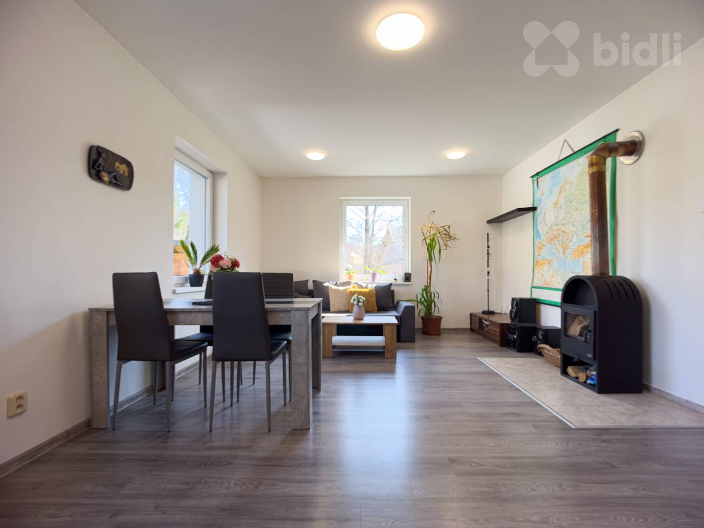 Podlahové elektrické topení, možnost topit i v krbových kamnech, elektrický bojler na ohřev vody. Nízké náklady na bydlení.